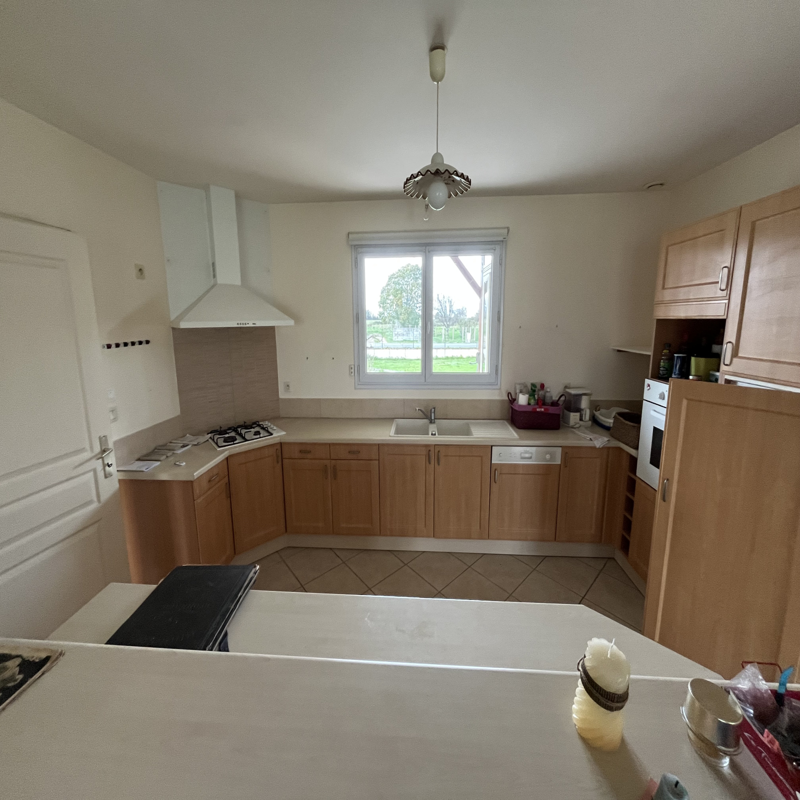 La maison édifiée en 2005 et bien entretenue se compose d’une entrée avec placard donnant sur une lumineuse pièce de vie de 46 M2 ouverte sur la cuisine meublée et équipée, d’une buanderie et d’un dégagement.